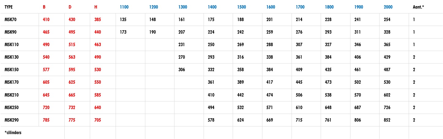 Breedte 1100-2000 mm Inhoud 135-852 liter